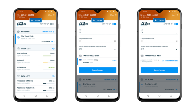 - Settings. The user can select the top-up amount and a monthly cap. The threshold is shown, but it is usually pre-set at the server-side and locked.