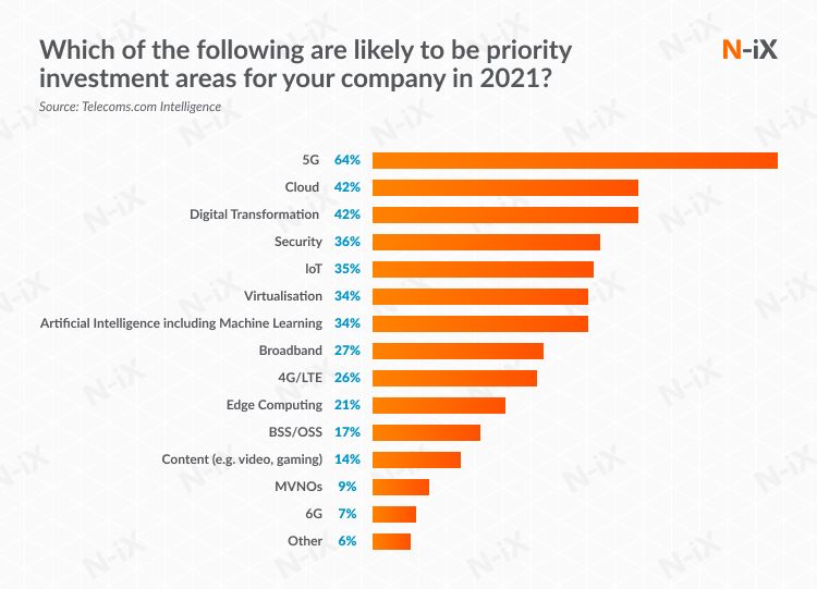When we think of a telecom company, we are used to imagining heavy infrastructure consisting of many towers, transmitters, data centers, cables, and wires, etc. It’s true, but now, more and more telcos decide to transform some of their physical infrastructures into digital, cloud-based applications. You may have heard about Vodafone, Rakuten, Deutsche Telecom moving parts of their infrastructure to the public cloud. This trend is going to evolve into 2022 and beyond. Cloud computing in telecom has great potential and as the results of the 2020 Annual Industry Survey by Telecoms.com Intelligence state, 5G, cloud, and digital transformation will be among top priorities for telecom companies in 2021.