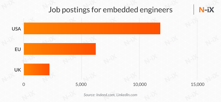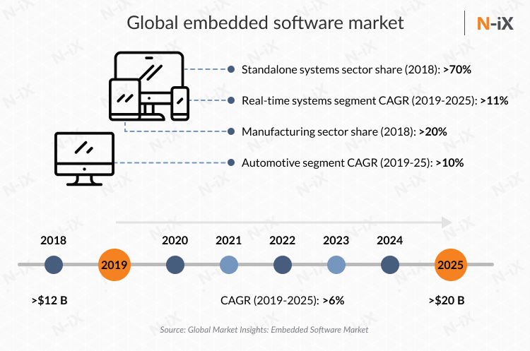 According to the Embedded Software Industry Analysis by Global Market Insights, the embedded software market was valued at $100B in 2019, and it is expected to surpass $250B in 2023. Companies operating in such industries as consumer electronics, industrial automation, military and defence, automotive, healthcare, and telecommunications are actively adding embedded software and firmware to their production cycles.