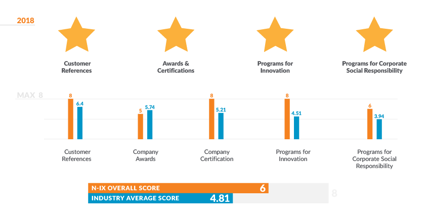 In 2018, the company was listed as a top company for Customer References, Awards and Certifications, Programs for Innovation, Programs for Corporate Social Responsibility. N-iX showed maximum excellence – 8 out of 8 in three core segments.