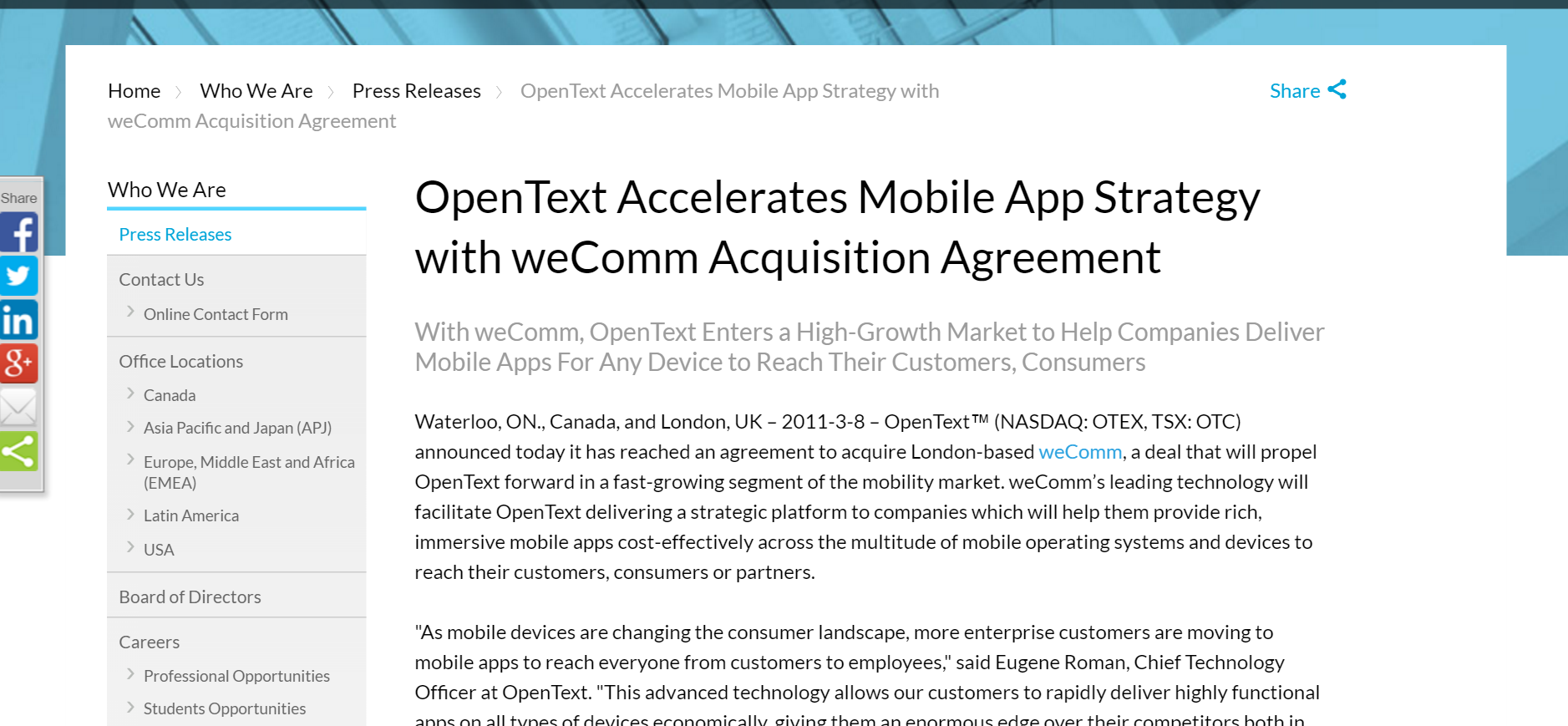 weComm’s leading technology facilitates OpenText delivering a strategic platform to companies which will help them provide rich, immersive mobile apps cost-effectively across the multitude of mobile operating systems and devices to reach their customers, consumers or partners.
