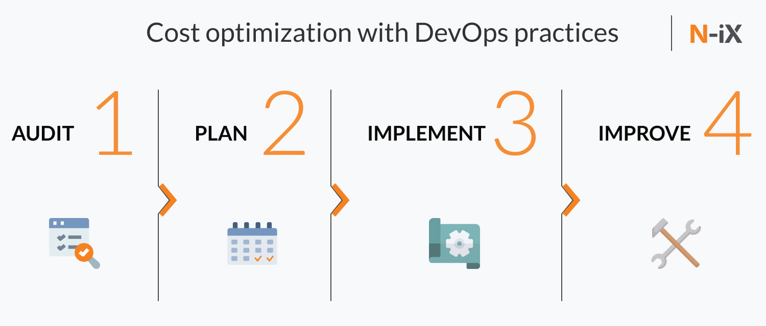 These practices allow you to have a clear picture of what resources you are using (Audit), analyze what areas can be optimized and how to do it (Plan), monitor spending of IT costs (Implement), and investigate new services that will help you reduce costs and optimize your infrastructure usage even more (Improve).
