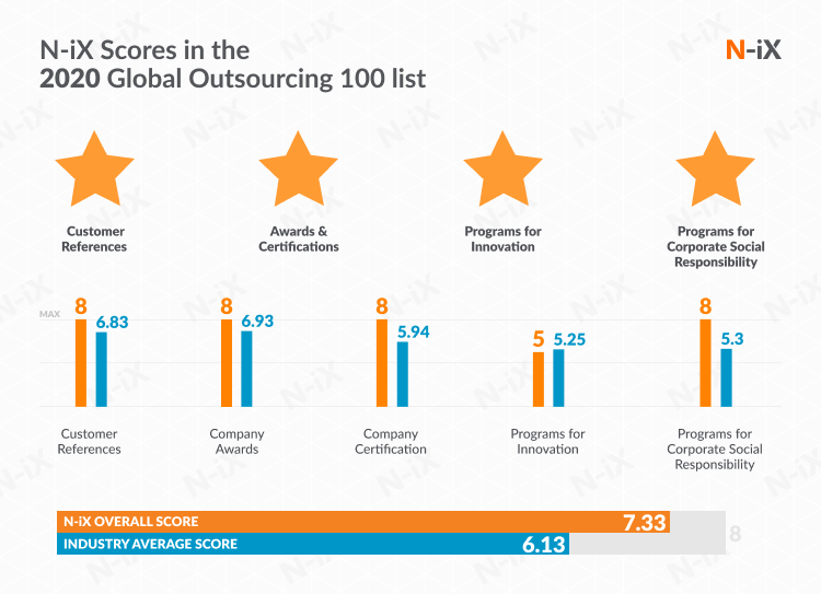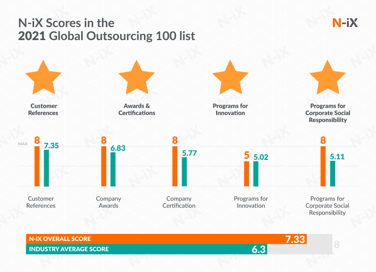 The Global Outsourcing 100 ranking compiled by IAOP annually is known as one of the most authoritative listings of outsourcing vendors in the world. It is based on a meticulous selection process including an independent review by a panel of IAOP customer members. The award recognizes service providers, advisors and consultants that demonstrate organizational excellence and continuously work on improving their business service models and outcomes. In spite of the fierce competition, N-iX got an exceptionally high score - 7.33 out of 8 points, while the average industry score is 6.30.
