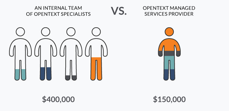 Running an internal OpenText team entails hidden costs of training, onboarding, and professional development. Plus, you experience the burden of payroll-related costs such as a social package, taxes, insurance, etc. All this bloats the total cost.